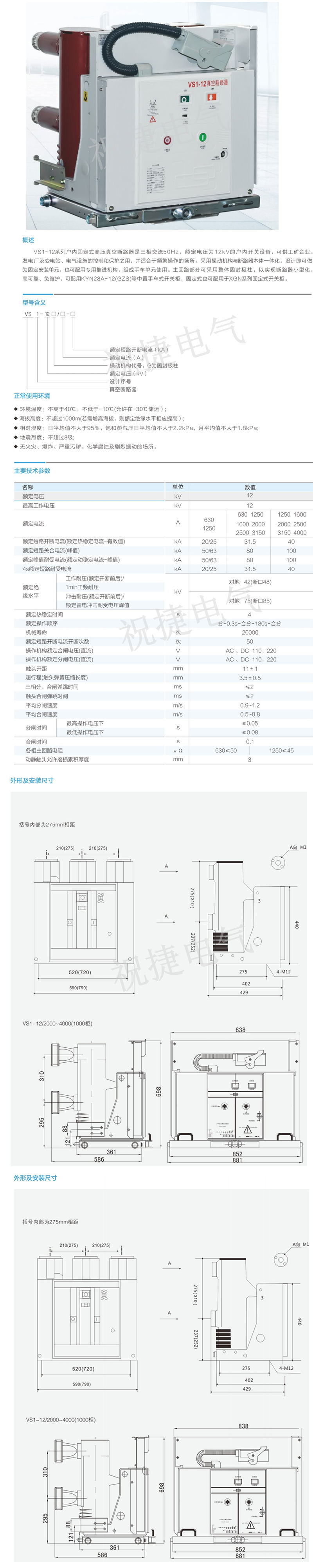 VS1-12户内高压真空断路器固定式