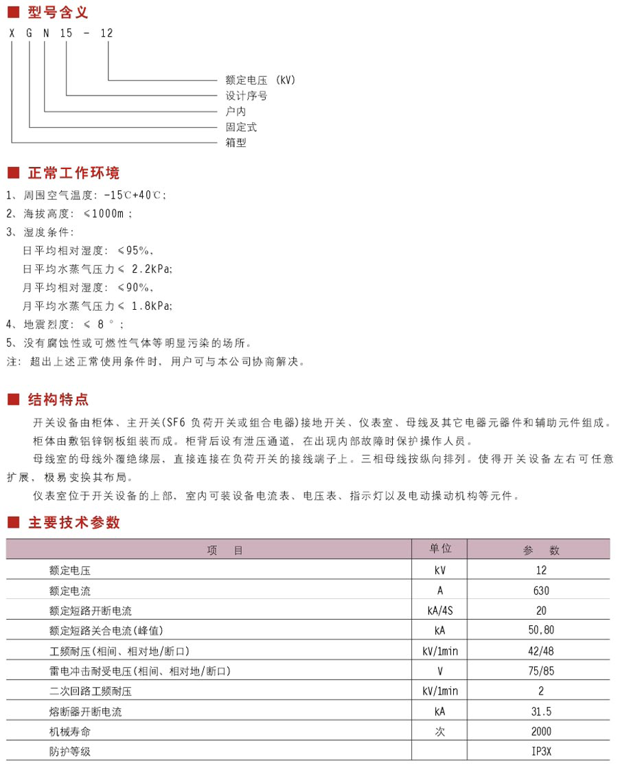 XGN15-12箱型固定式户内交流金属封闭开关设备(简称“开关设备”),用于额定电压为12KV、额定电流630A及以下和环网供电或辐射型供电系统中,尤其适合装入预装式变电站作为电力系统的控制和保护。